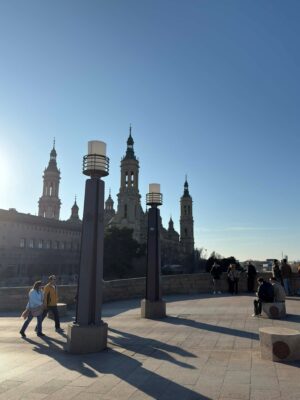W niedzielę, zaraz po przylocie do Saragossy, razem z kolegami od razu ruszyliśmy zobaczyć najbardziej charakterystyczny zabytek miasta – monumentalną Bazylika Nuestra Señora del Pilar. Już z daleka zachwyciły nas jej potężne wieże i kopuły wznoszące się nad rzeką Ebro. Pogoda była świetna, słońce świeciło wysoko, atmosfera była przednia, w końcu dopiero co przyjechaliśmy do Hiszpanii. Bazylika zapierała dech w piersiach, jej barokowy przepych bardzo kontrastował z nowoczesną architekturą, jej okolice również były bardzo imponujące, piękny plac oraz kamienny most za samą Bazylika. To było świetne rozpoczęcia tego dynamicznego miesiąca praktyk.